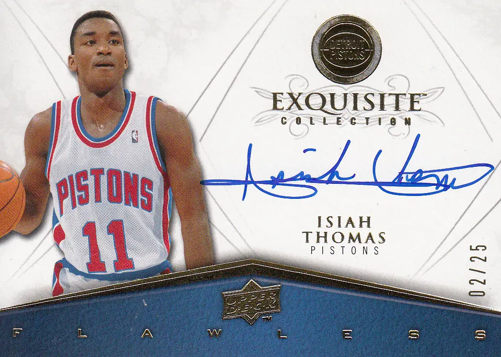 Card Snapshot: Details for the 2008 Exquisite Isiah Thomas card #FLAW-IT (Detroit Pistons). Variant: Autograph. Numbered: #02/25. View high-res images and collector facts.