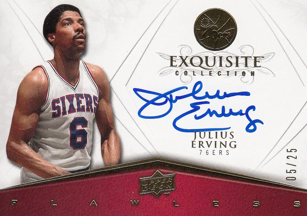 Card Snapshot: Details for the 2008 Exquisite Julius Erving card #FLAW-JE (Philadelphia 76ers). Variant: Autograph. Numbered: #05/25. View high-res images and collector facts.