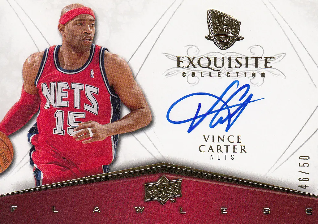 Card Snapshot: Details for the 2008 Exquisite Vince Carter card #FLAW-VC (New Jersey Nets). Variant: Autograph. Numbered: #46/50. View high-res images and collector facts.