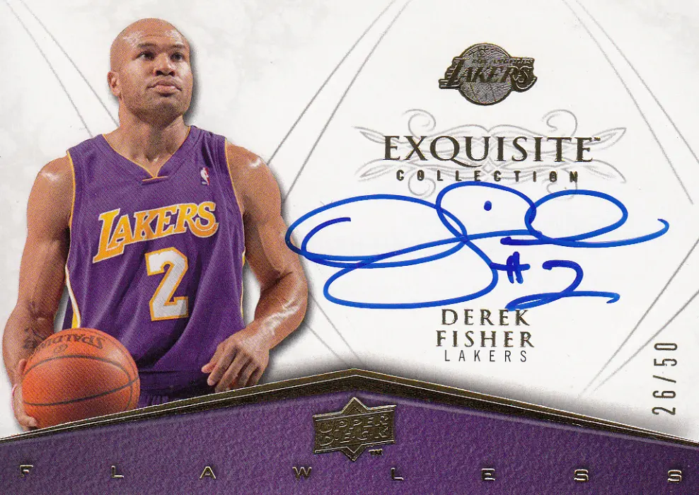 This unique Derek Fisher card is a highlight of the 2008 season. Produced by Upper Deck as part of the Exquisite set, this specific card features the Flawless theme. It is the Autograph version, offering a distinct look compared to the base set. This is a limited edition card, serial numbered #26/50. It captures Derek Fisher during their time with the Los Angeles Lakers.