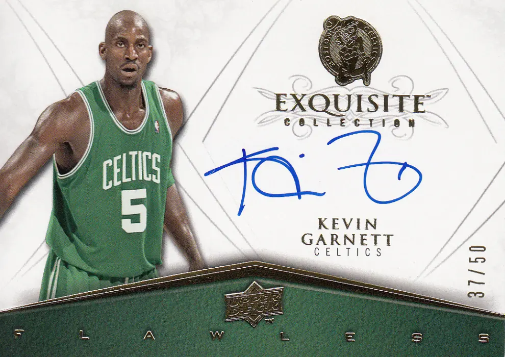 On this 2008 Exquisite card, Kevin Garnett is shown as a member of the Boston Celtics.