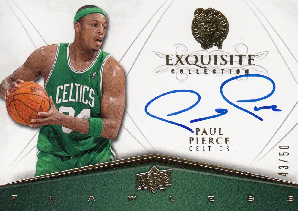 This unique Paul Pierce card is a highlight of the 2008 season. Produced by Upper Deck as part of the Exquisite set, this specific card features the Flawless theme. It is the Autograph version, offering a distinct look compared to the base set. This is a limited edition card, serial numbered #43/50. It captures Paul Pierce during their time with the Boston Celtics.