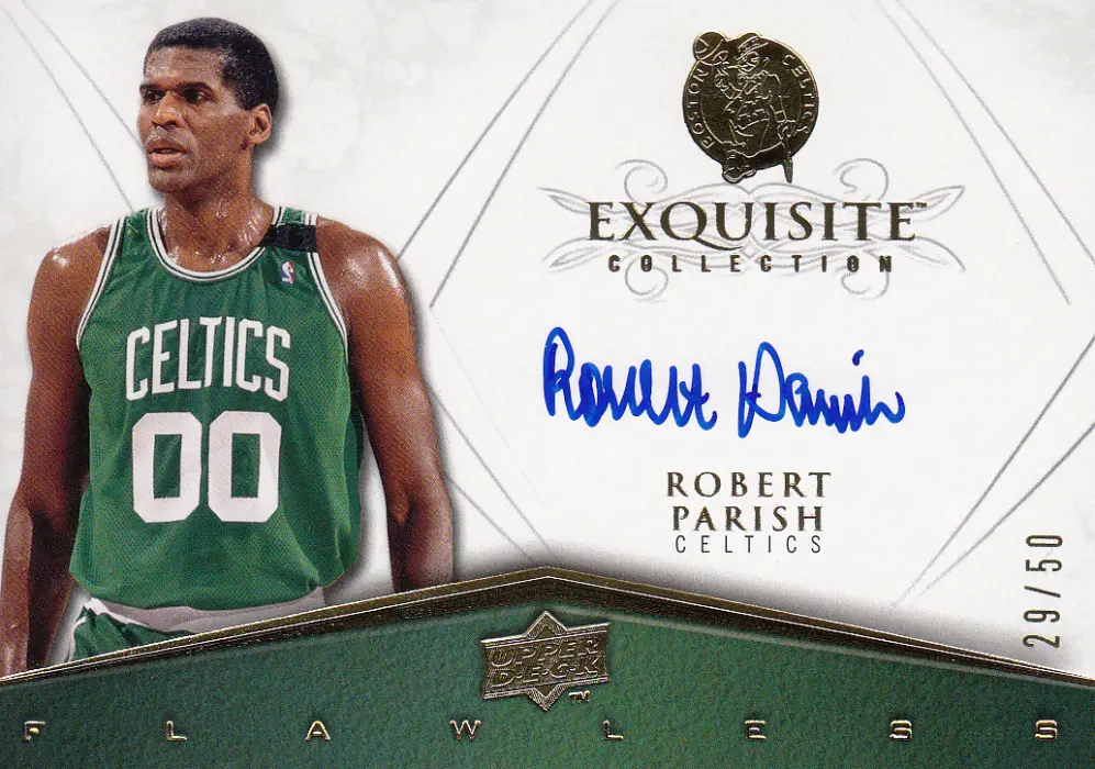 This unique Robert Parish card is a highlight of the 2008 season. Produced by Upper Deck as part of the Exquisite set, this specific card features the Flawless theme. It is the Autograph version, offering a distinct look compared to the base set. This is a limited edition card, serial numbered #29/50. It captures Robert Parish during their time with the Boston Celtics.
